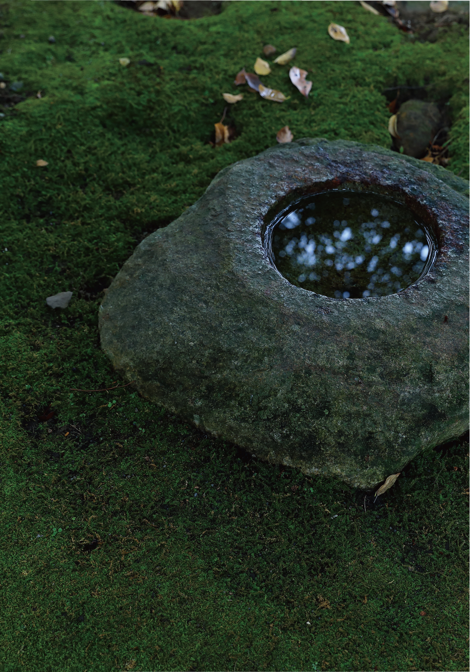 茶室「雨聴天」は国宝茶室「待庵」をもとに設計され、入口前の沓脱石には光学硝子が用いられる。内部は二畳台の小空間だが、壁面の小さな窓から光が差し込み、その陰影が空間に奥行きをもたらせている。