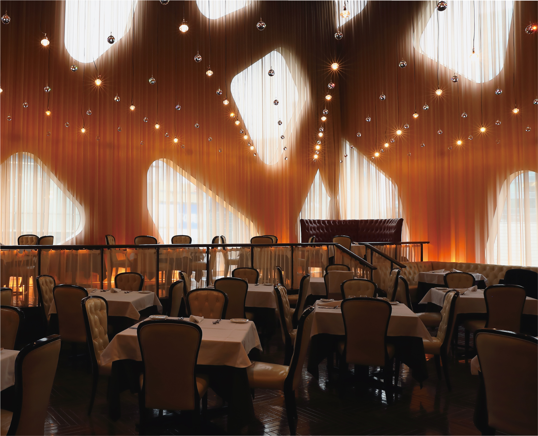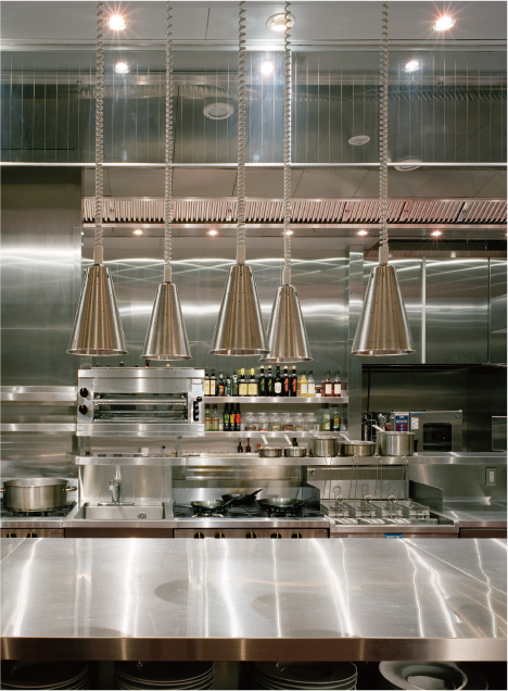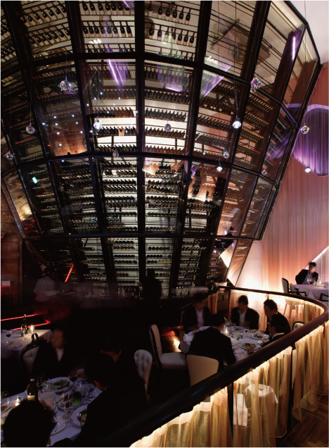 大人の世界へのストーリーは、エレベーターに乗るその瞬間から始まる。上階へと昇る箱の中は暗がりとなり、到着階で扉が開いた瞬間、いきなり活気あるキッチンが登場。さらに上階へ行くと、そこは天井高9mの巨大な吹き抜け空間。都市の喧騒が届かない静けさのなか、天井から吊るされたいくつものスワロフスキーが輝き、心が躍りだす。さらに、そこにある2000本を超える巨大なワインセラーの圧倒的なスケール感を前にして、これ以上ないほどに気分が上がる。