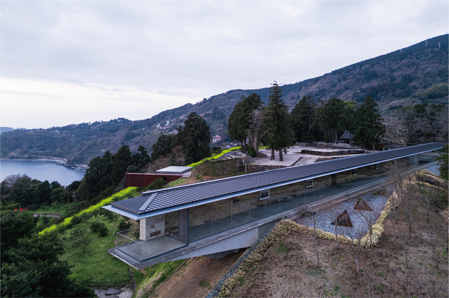 Japanese architecture has historically developed in close relation to terrain and climate, centered on natural materials. At Enoura Observatory, some facilities appear to utilize the slope toward the sea, making light and views integral elements of their spatial composition.