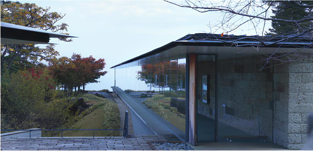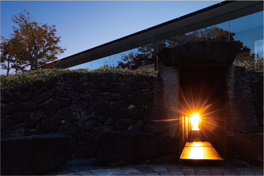 The “Summer Solstice Light-Worship 100-Meter Gallery” symbolizes the concept with an axis opening toward the sea, combining Oya stone and glass. It appears to employ a design that integrates natural light and the seascape, linking the view with both natural and artificial materials.