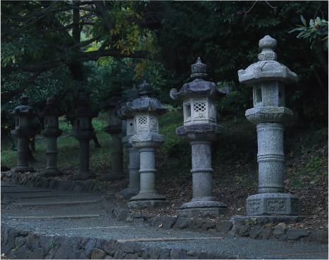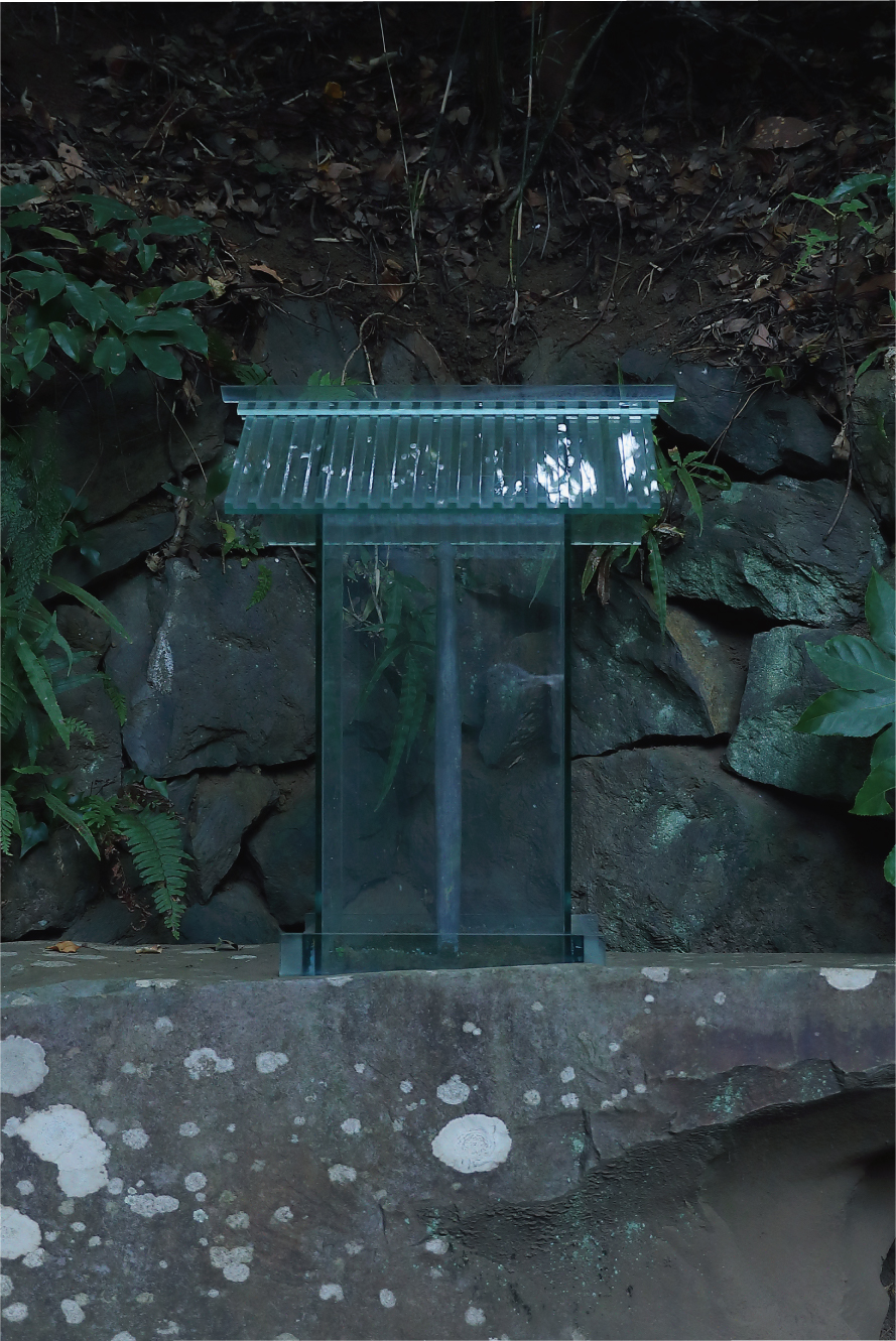 さらに歩を進め「光学硝子舞台」からぐるりと周って坂を下る。小径を行くうちに「榊の森」へ。ここでは細見古香庵が長年集めてきた石仏たちが、小径の脇に並び柔らかな影を連ならせている。それぞれの表情は柔らかく、苔むした頬の曲線やわずかな欠けに、ひとつずつが異なる土地の祈りを静かに宿しているようだ。