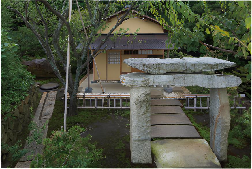 素材への意識は、石舞台や庭園にさらに明確に現れている。敷地に用いられる石材には近隣産の根府川石や小松石があり、庭園の景石には早川石丁場群跡から出土した江戸城石垣用の巨石が使われている。石材は、地質や歴史を示す要素となり、造園は景観づくりだけではなく、歴史を読み取る手掛かりになっている。