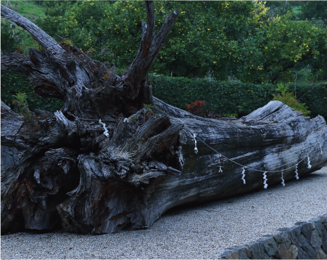「榊の森」を抜けると5億年前の化石などが陳列された「化石窟」、側には縄文時代の後期のものといわれる石棒が供えられ、遥か昔の祈りがほのかに感じられる。ここから竹林へ向かう。途中に現れる、杉本博司氏の作品「数理模型0010 負の定曲率回転面」の抽象的な造形が、自然の風景に理知的な違和感を生みだしている。