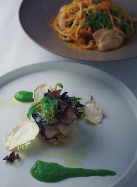 ここで提供されるのはモダンイタリアン。日本各地の旬を集め、手間を惜しまない調理で素材本来の魅力を引き出しながら、盛り付けや構成によって一皿ごとに小さな驚きを添えることを心がけている。