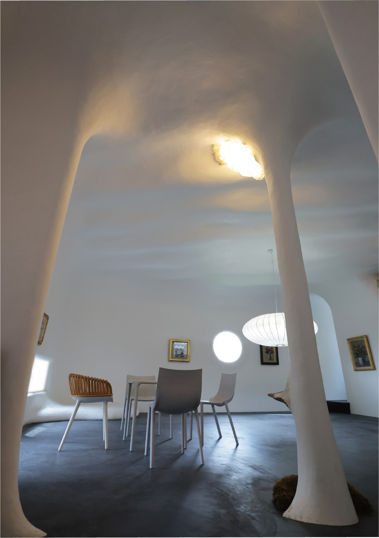 玉木さんはどうしてこれほど柔らかな空間をつくろうとしたのですか?「僕は若い頃大阪に住んでいました。都市で目にするのは人工的な直線ばかりなんですね。見ているとすぐに飽きしまう。今は足守から車でそれほど遠くない場所に住んでいます。このあたりは緑が豊かで、風景に直線はほとんどありません。自然は曲線でできていて、それは美しく、ずっと見ていられ、そこにいるだけでゆったりとした気持ちになれるのです」。