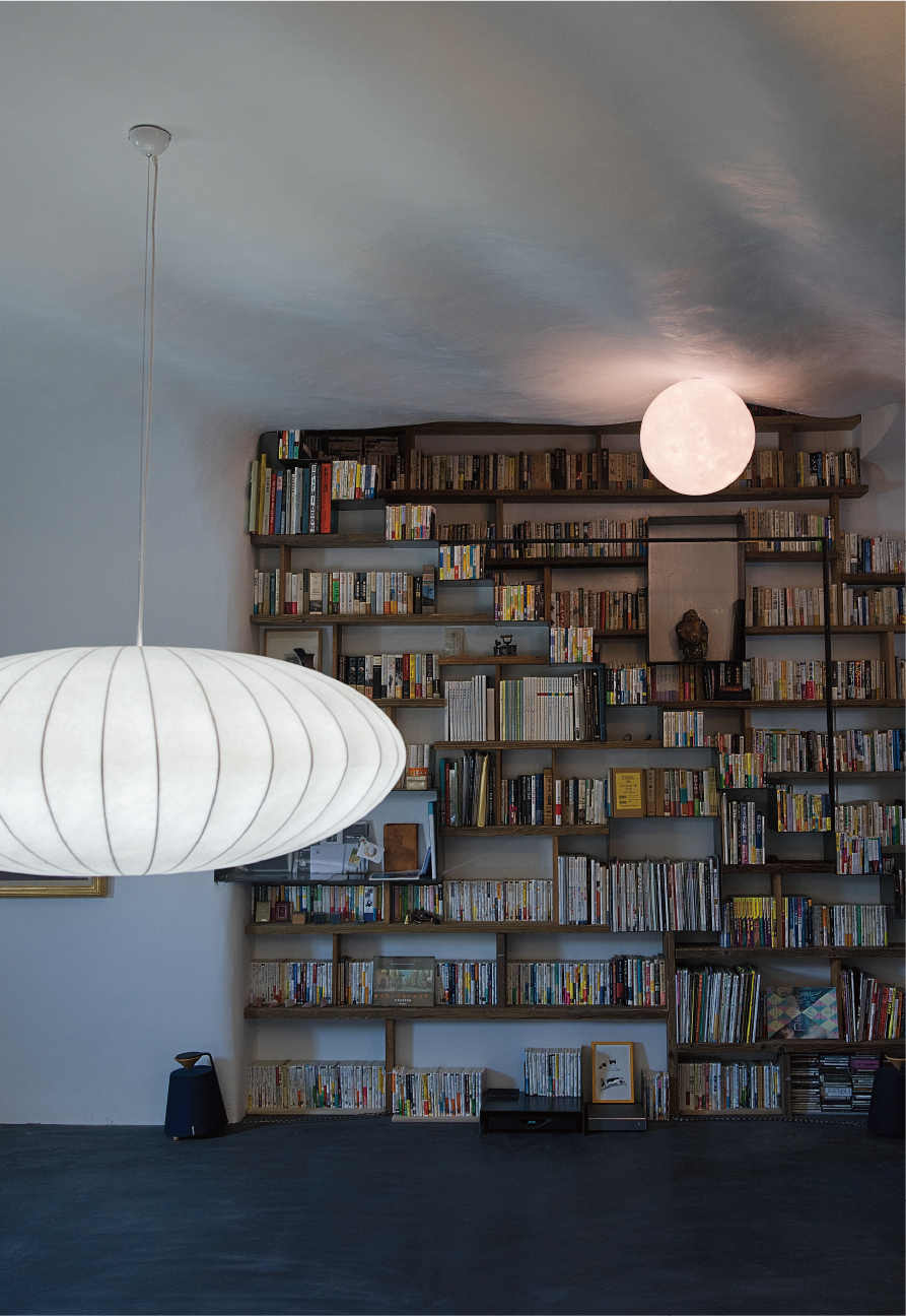 そうしてこだわりが詰まった空間には、既製品がない。「若山さんが一言『既製品は嫌だね』と。それは僕も同意だったので、すべて僕がつくるか、あるいは特注にしました。例えば天井から吊るされた照明は柔らかな曲線からできています。軽い鉄板で構成された本棚も、軽く浮いた感じを大切にしています。どれもこの空間のためにあります」。