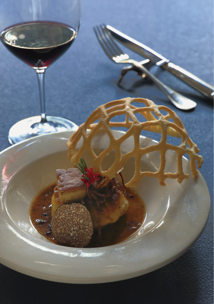 ① Make the wrapper using butter, egg, flour, and water. ② Mix the filling ingredients: veal fillet, truffle, foie gras, fond de veau, garlic, and salt. ③ Wrap the filling in the skin, shape it using a ring mold (cercle), and pan-fry in butter. ④ Place the sauce on the plate, set the gyoza on top, and garnish with pan-seared foie gras, truffle, fried shallots, and herbs. Cover with the dome-shaped tuile.