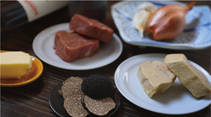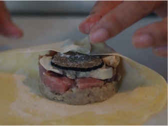 ②仔牛のフィレ、トリュフ、フォアグラ、フォンドボー、ニンニク、塩を和えて餡にする。