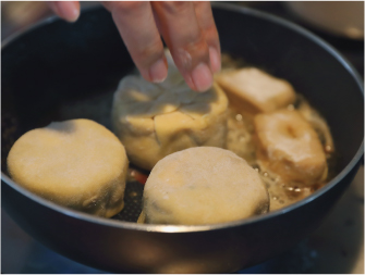 ③餡を皮で包み、セルクルを使って成形し、バターで焼く。