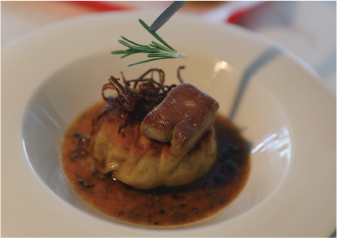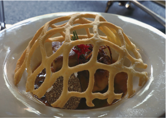 ④お皿にソースを敷き、餃子を置き、トッピングのフォアグラソテー、トリュフ、エシャロットのフライ、ハーブを盛り付ける。ドーム状にしたチュイールをかぶせる。