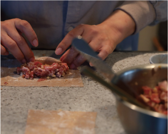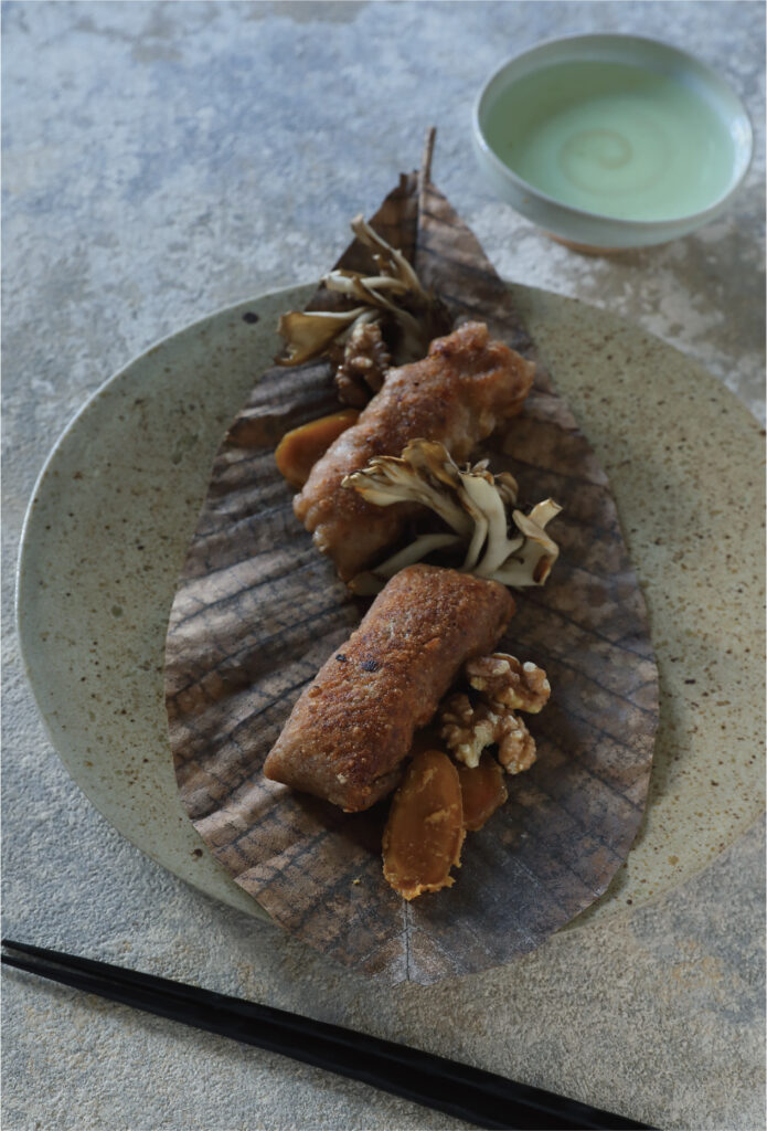 In creating gyoza imbued with the spirit of Nara, I learned that Mariko Matsui focused on the powerful Jomon and Asuka periods of Nara’s history. She brought Nara’s culture to life in the gyoza by using gibier and nuts, along with narazuke (pickles preserved in sake lees) and wild boar meat, to express the region’s traditional flavor. Now, I will introduce the recipe.The ingredients for Nara-style gyoza are: the wrapper uses ancient wheat and medium-strength flour; the filling includes wild boar, pork, ginger narazuke, walnuts, and maitake. I will plate the gyoza, walnuts, and narazuke on a magnolia leaf (Hoba).① I knead roasted and ground ancient wheat with medium-strength flour and water to make the patterned wrapper. ② I mix wild boar, pork, ginger narazuke, walnuts, maitake, and salt for the filling. ③ I wrap and cook the gyoza. ④ I arrange the gyoza, walnuts, and narazuke on a magnolia leaf (Hoba).Now, how is the taste?I tasted the gyoza and found the strong flavor of the wild boar meat skillfully neutralized by the ginger narazuke, resulting in a well-balanced taste. The nutty texture provides a great accent, adding richness to the flavor. It has a distinctly Japanese feel, evoking remnants of an ancient era. I concluded that this is truly a flavor unique to Nara—a gyoza I would love to savor while listening to the bells of Horyuji Temple.