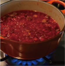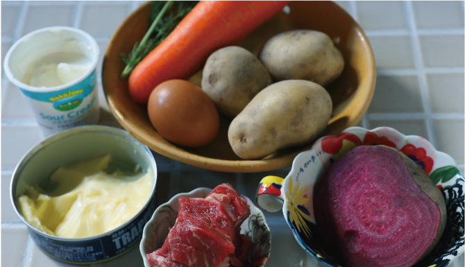 ①牛肉と野菜(ビーツ、キャベツ、人参、玉ねぎ)を炒め。ブイヨントマトペースト、酢を加えて煮込み、ボルシチをつくる。