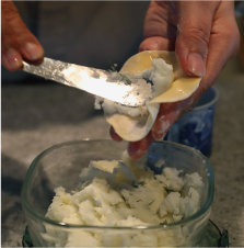 ③ジャガイモを茹でて潰し、バターで炒めた玉ねぎ、刻んだディル、塩胡椒と混ぜ合わせた餡をつくる。