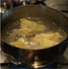 ④餡を三日月状の形に包み、茹でる。