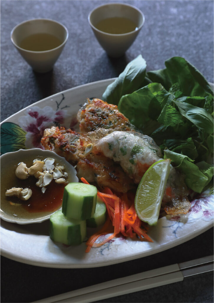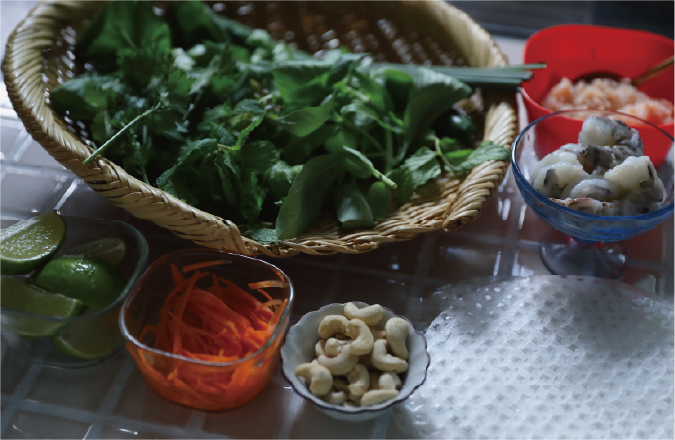具材は、皮にはライスペーパー。餡にはエビ、鶏肉、パクチー、ニンニク、生姜。付け合わせとしてレタス、ミント、にんじん、きゅうり、カシューナッツ、ライム。ソースはヌクマム、レモングラス、ニンニク、チリソース。 作り方は、