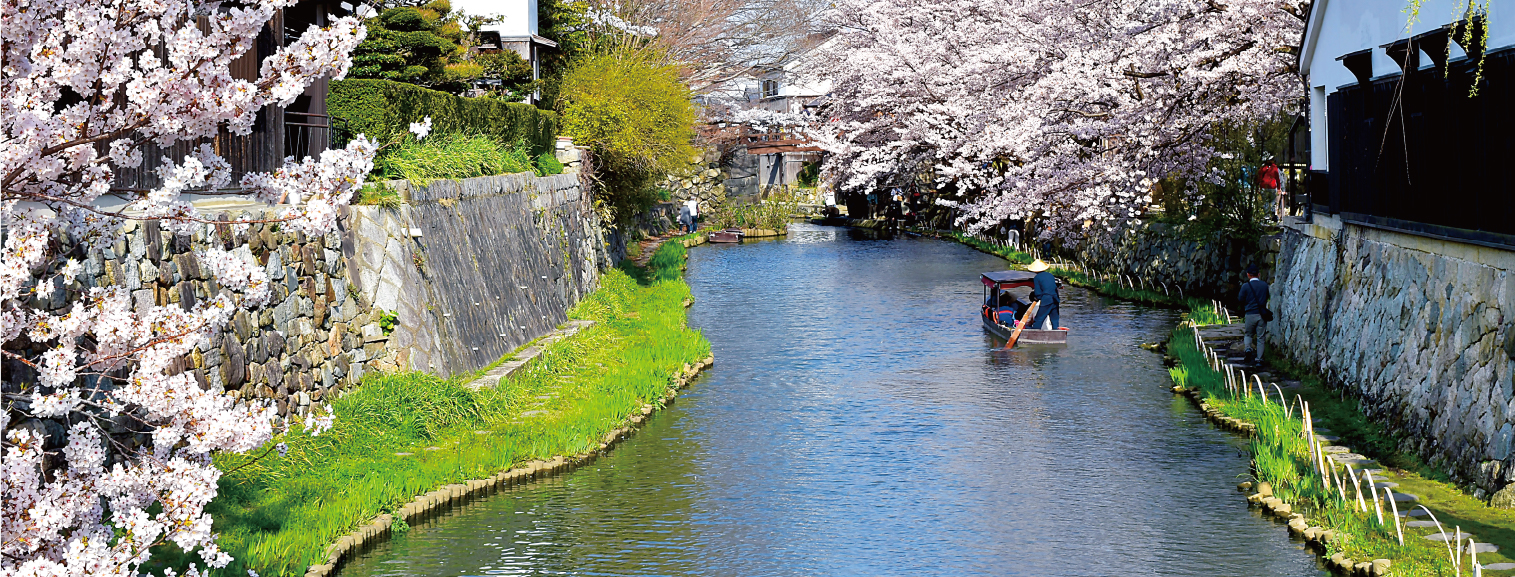 かつて織田信長公によって安土城が築かれ、信長公亡き後、豊臣秀次公により城下町として発展した地、近江八幡。自由商業都市としての発展を目指して楽市楽座が施行され、城の防御である八幡堀を琵琶湖とつなぎ、往来する船を寄港させるなど、秀次公が八幡山城在城のわずか5年の間に、商いのまちとしての繁栄の基盤が築かれました。日本だけでなく海外でも活躍した近江商人の息吹と歴史を感じる商家の町並みと八幡堀、大正中期から昭和初期に建てられ今も多くの人を魅了し続けるヴォーリズ建築、国の重要文化的景観の第一号として選定された近江八幡の水郷など、魅力あふれる町並みが残っています。